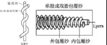氨綸包覆紗是以氨綸絲為芯,以長(zhǎng)絲或短纖維紗線按螺旋形的方式對(duì)伸長(zhǎng)狀態(tài)的氨綸絲予以包覆而形成的彈力紗。